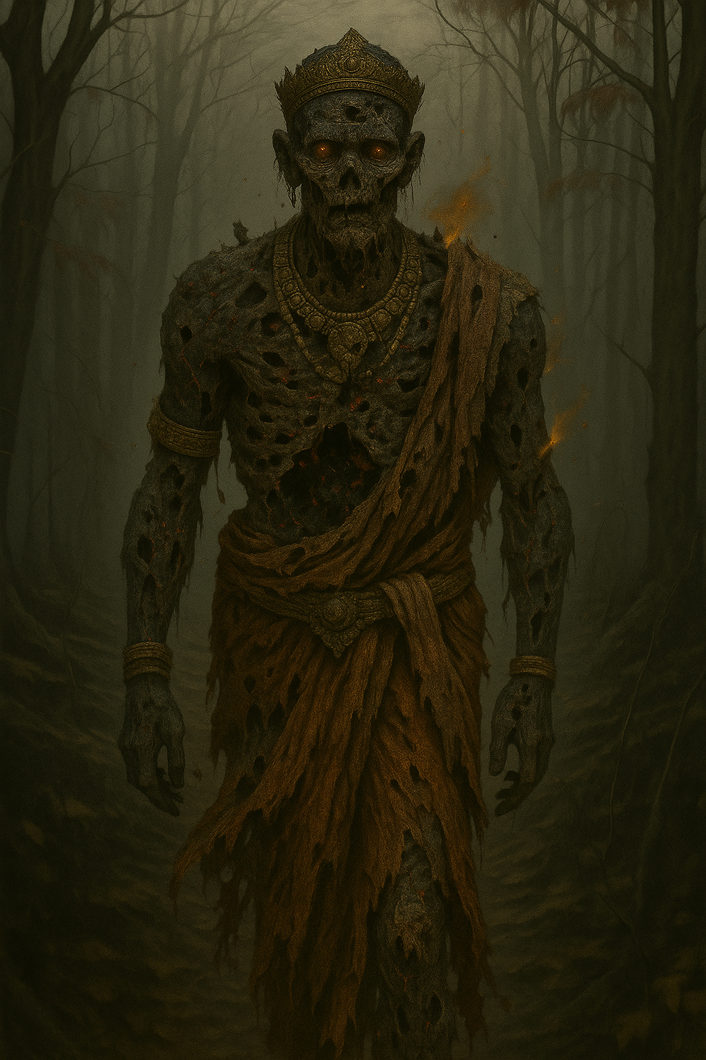 The sun fell low, bleeding gold through the skeletal canopy. Its light struck the hollow leaves and bent twigs at strange angles, making the forest appear fractured, as if a memory had been cut and reassembled wrong. Shadows pooled beneath the trunks, moving a heartbeat behind their sources, lagging like echoes from another time.